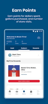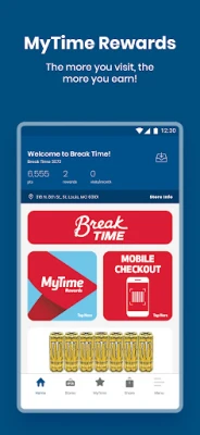 The Break Time app is a “must have” for customers of Break Time convenience stores in Missouri. Get great deals on snacks and beverages with app coupons! Manage your MyTime Rewards account and redeem points for even more discounts and free stuff from our loyalty program. Tap into Mobile Checkout and save time by checking out and paying with your phone. No more lines!