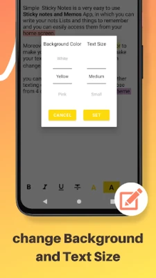 You can change the background color of your simple sticky notes widget from the given 4 colors in the App. you can also change the size of text in the editor to small, Large or default Medium. It is a very lightweight, and easy to use sticky notes widget. Both colors and text size can be changed while creation as well as while Editing. The Simple Sticky Notes Widget is Resizable and can be placed anywhere. you can create as much as Widgets as you want with different Colors, Text Sizes, and widget sizes.